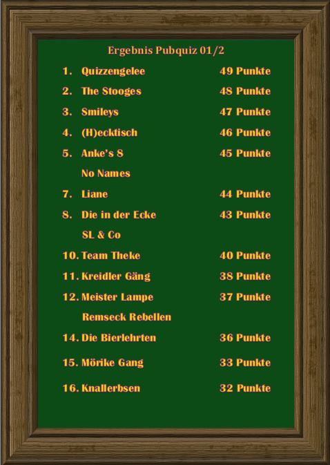 siegte das Team "Quizzimodo" vor den "No Names". Platz drei belegte das Team "(H)ecktisch" mit 47 Punkten.